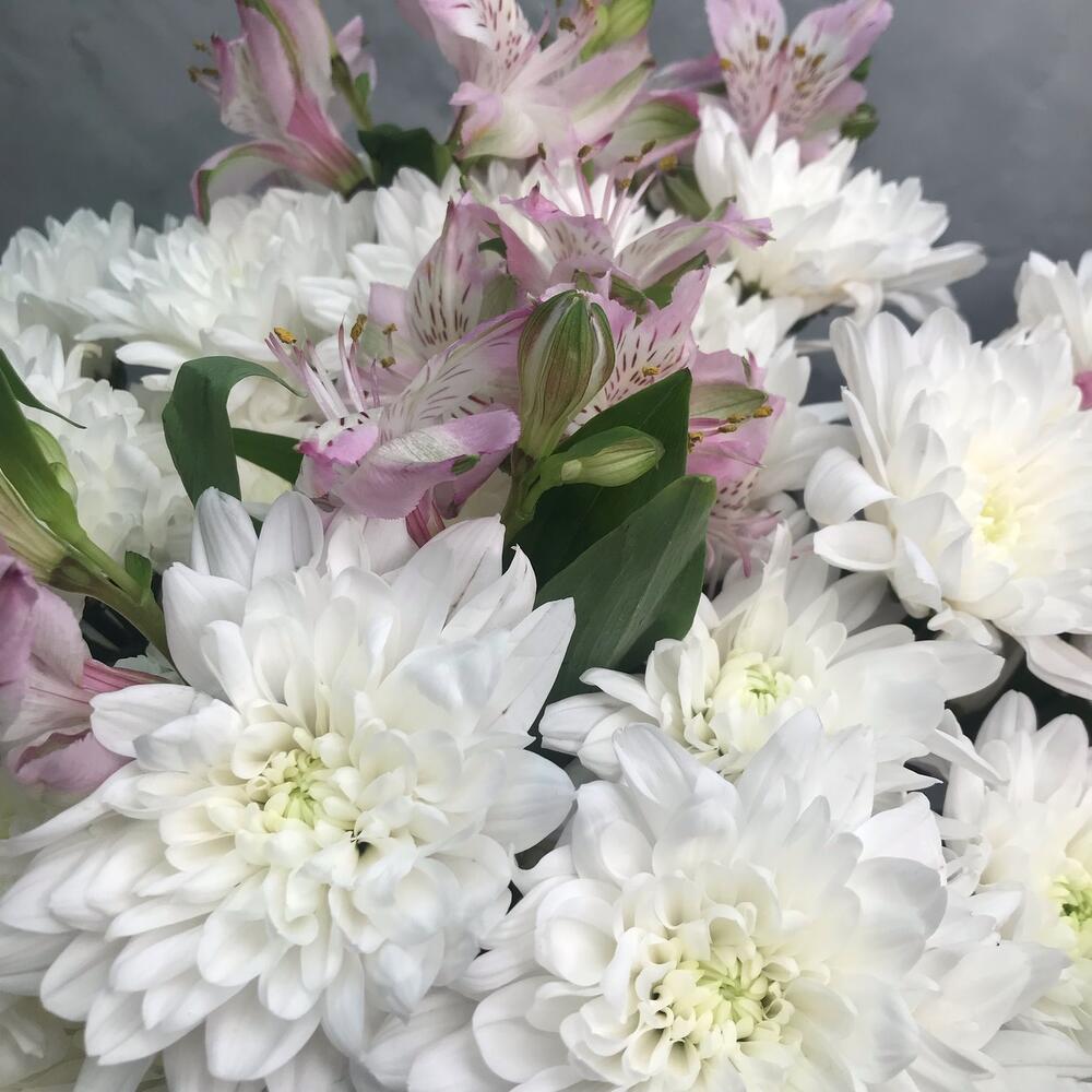 Хризантема балтика белая – 7 шт.Альстромерия – 5 шт.Лента атласная – 2 шт.