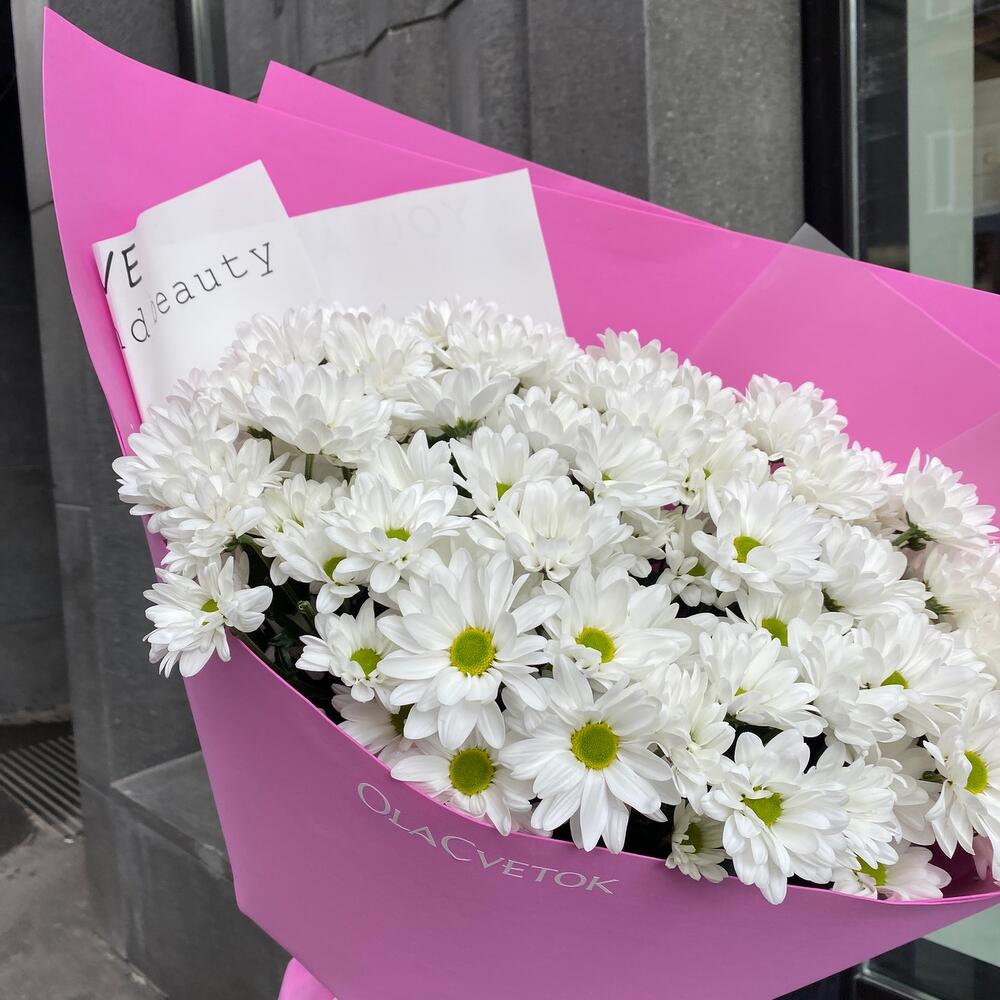 Хризантема кустовая – 13 шт.Фоамиран – 4 шт.Пленка дизайнерская – 2 шт.Лента атласная – 2 шт.