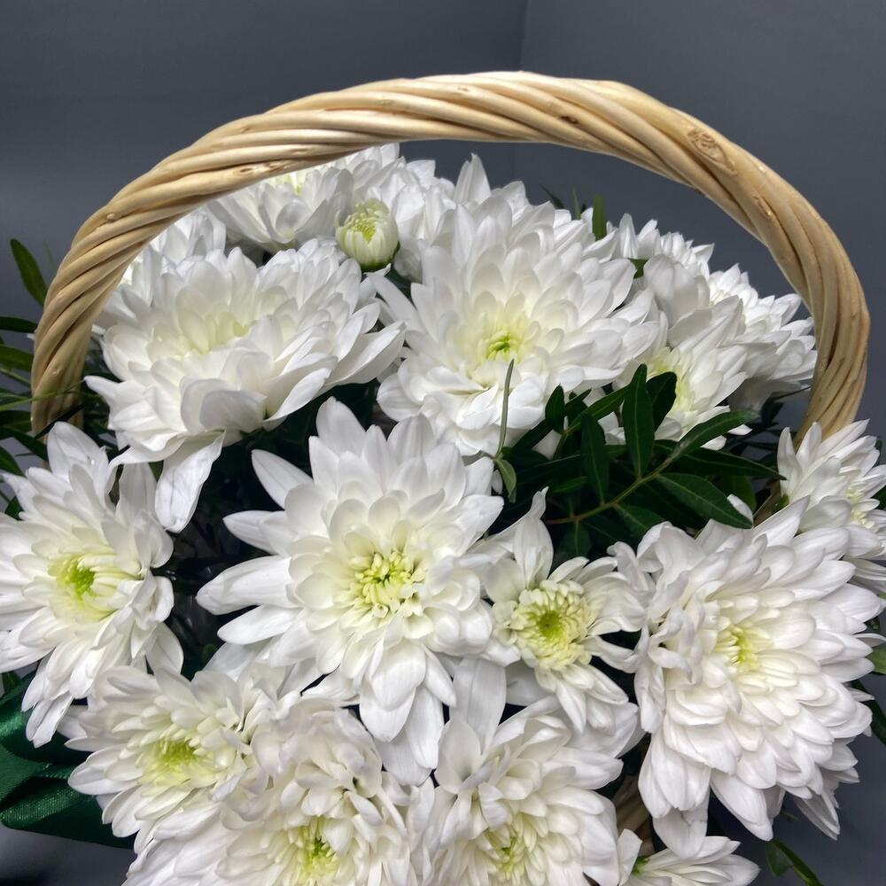 Хризантема кустовая – 7 шт.Зелень – 1 шт.Корзина плетеная – 1 шт.Оазис флористический – 1 шт.