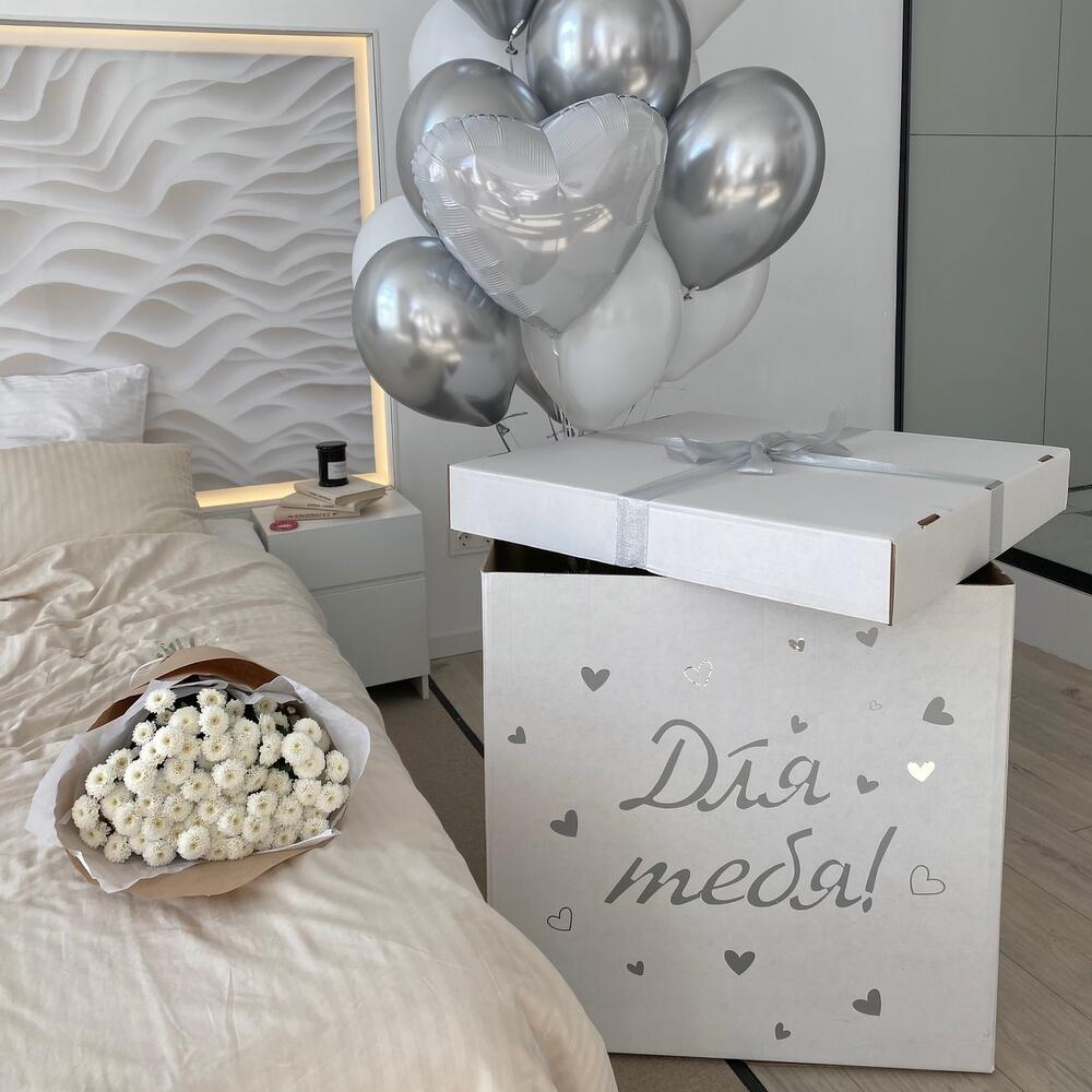 Набор шаров в коробке + цветы Надпись на коробку может быть абсолютно любой В сет входят:- букет кустовых хризантем / 9 штук – огромная коробка – сюрприз 70см*70см с вашей индивидуальной надписью- фонтан из 11 шаров / в подарок обработка для длительного полёта, стильные ленты и грузик В фонтан входят: – 5 шаров хром- 4 латексных шаров – 2 фольгированных шара