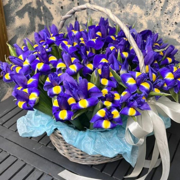 Ирис синий – 51 шт.Корзина плетеная – 1 шт.Упаковка дизайнерская – 1 шт.Лента атласная – 2 шт.Открыточка с вашими пожеланиями – 1 шт.хорошее настроение – 100 шт.инструкция по уходу за цветами – 1 шт.Кризал – 1 шт.