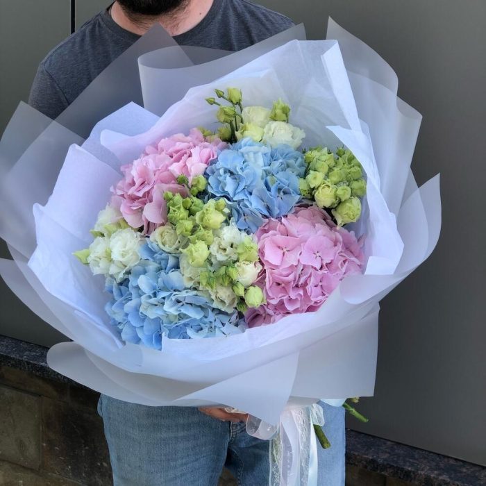 Гортензия – 4 шт.Эустома – 5 шт.Тишью – 4 шт.Упаковка дизайнерская – 6 шт.лента премиум – 2 шт.