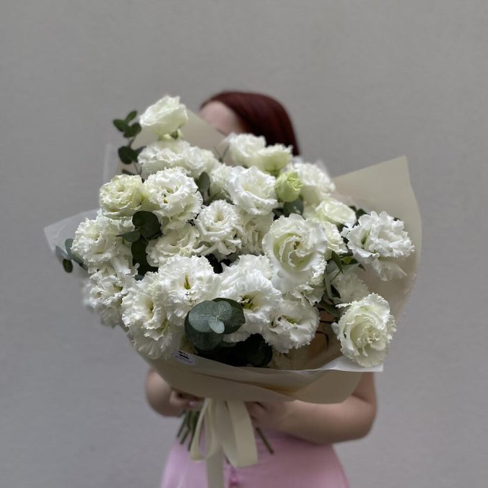 Моно букет из хрустящих лизиантусов с добавлением эвкалипта.