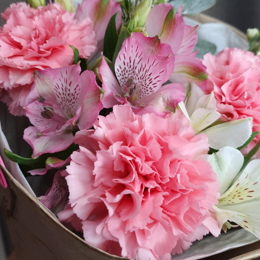 Букет с диантусами ,лизиантусом т альстромерией