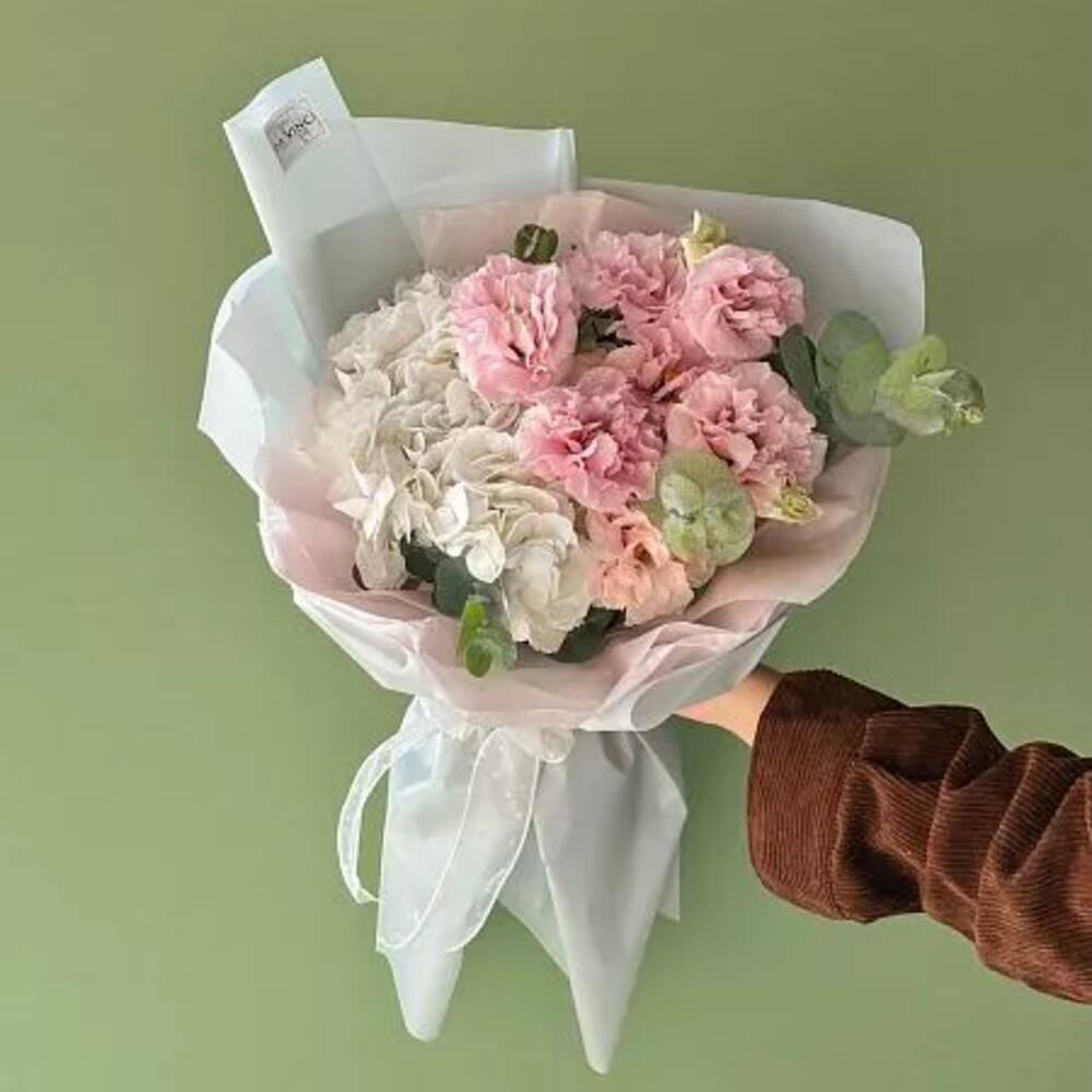 Букет из маттиолы, гипсофила, лизиантуса, герберы