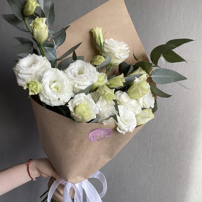 Эустома – 7 шт. Упаковка – 1 шт. Атласная лента – 1 шт. Эвкалипт – 2 шт.