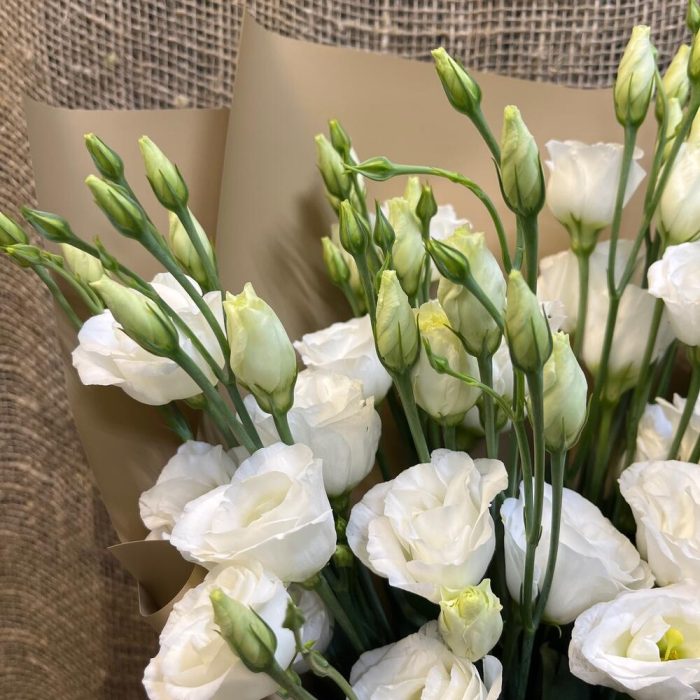 Лента атласная – 2 шт.Лизиантус (эустома) – 5 шт.Упаковка корейская пленка – 1 шт.