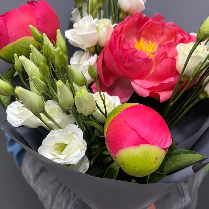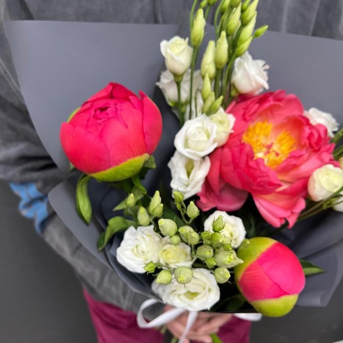 Лизиантус белый – 3 шт.Лента атласная белая – 1 шт.Упаковка корейская пленка – 1 шт.премиум пион Коралл шарм – 3 шт.