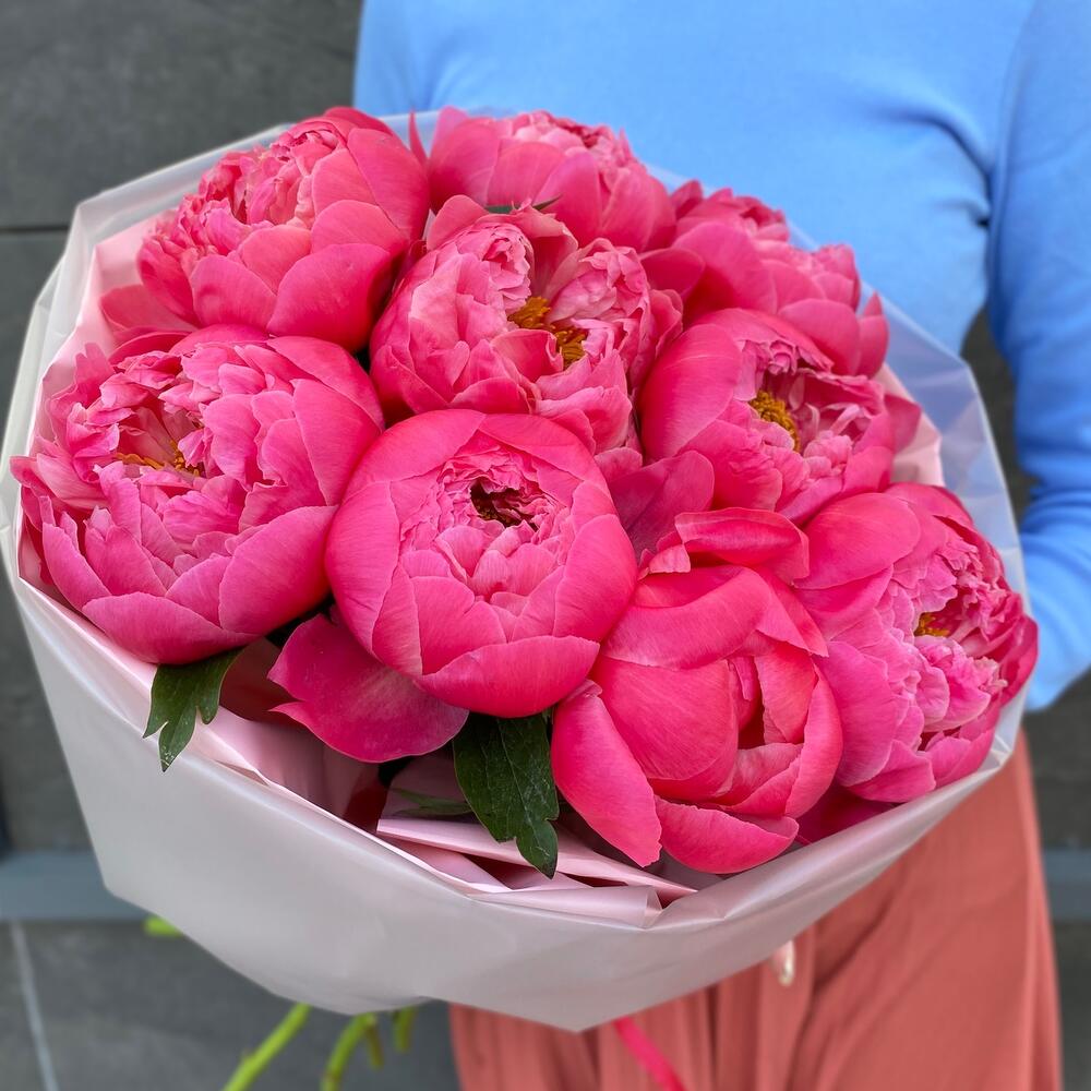 Букет 9 Пионов премиум коралл шарм