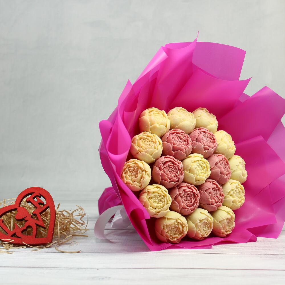 Атласная лента – 1 шт.Прозрачная пленка – 1 шт.авторская пленка – 1 шт.шоколадные пионы из бельгийского шоколада – 19 шт.