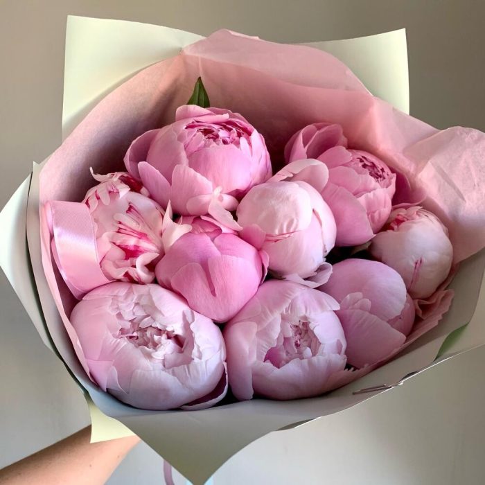 Лента атласная – 4 шт.Пион Сара Бернар – 9 шт.Упаковка дизайнерская – 4 шт.Средство для продления жизни цветов – 2 шт.инструкция по уходу за цветами – 1 шт.