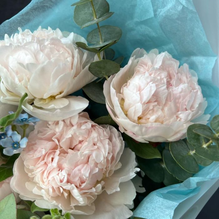 Пион – 5 шт.Эвкалипт – 2 шт.Атласная лента – 1 шт.Оксипеталум – 3 шт.декоративная упаковка – 1 шт.