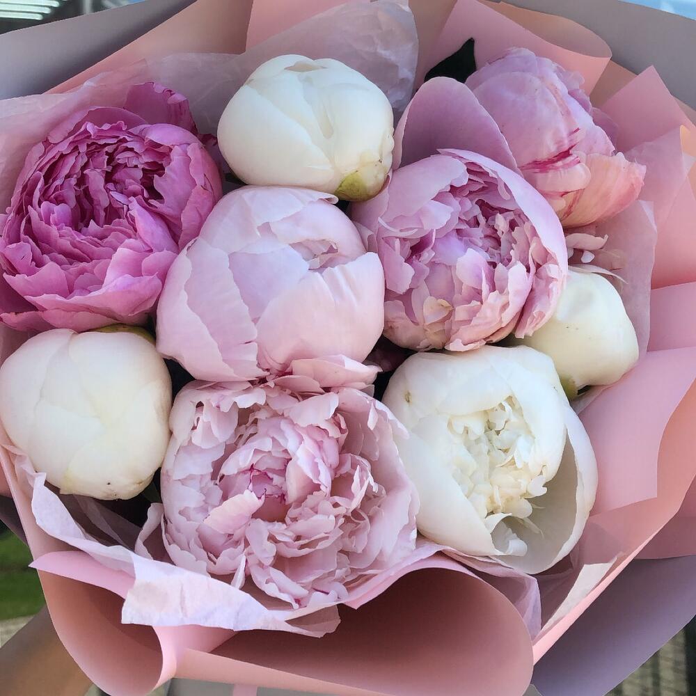 Пион Сара Бернар – 5 шт.Оформление – 1 шт.пион одиль – 4 шт.