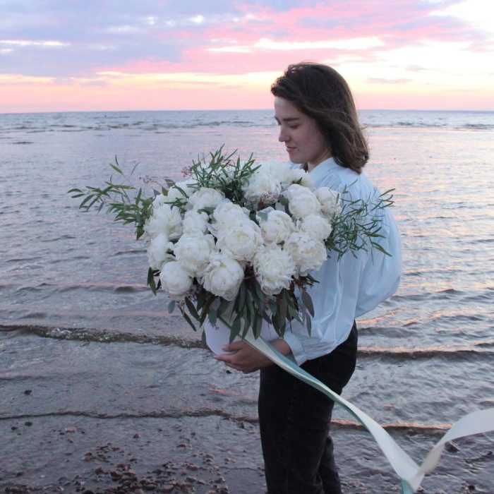 Эвкалипт – 10 шт.Лента атласная – 2 шт.Тишью – 2 шт.Коробка шляпная – 1 шт.Пион Голландия – 25 шт.Оазис флористический – 2 шт.