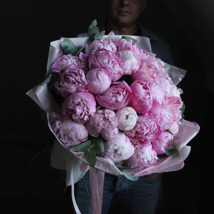 Роскошный букет из 29 голландских пионов Сара Бернар.Стильное цветочное решение для любого случая.Ширина букета около 60 сантиметров, высота пионов около 65 сантиметров.