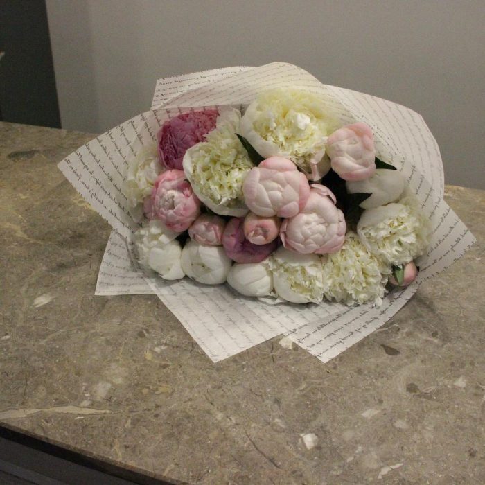 Пион – 19 шт.Лента атласная – 1 шт.Упаковка дизайнерская – 1 шт.