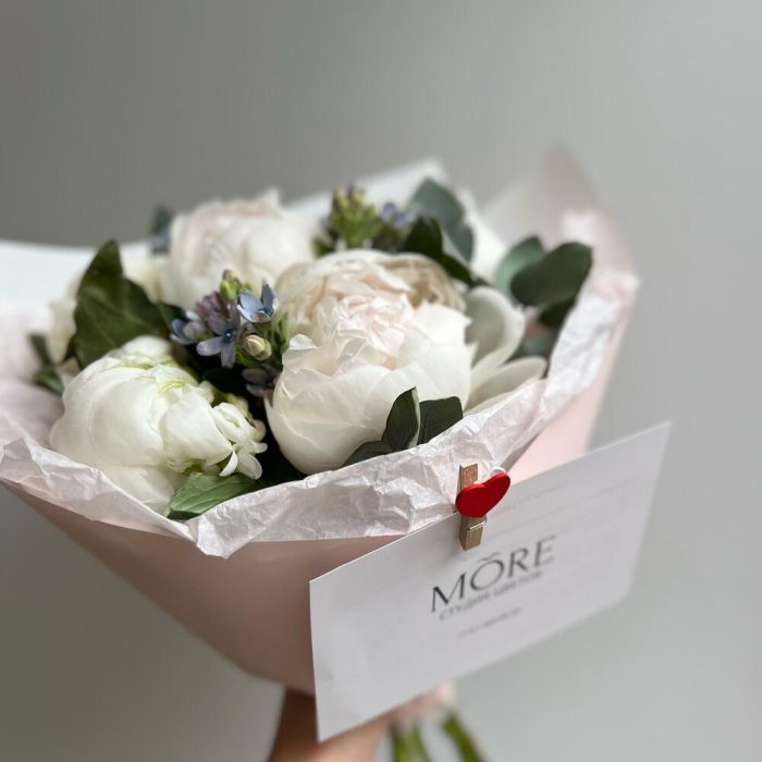 Стильный букет пионов для любимой и голубой оксипеталум