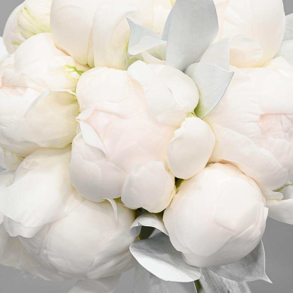 Элегантный свадебный букет в белой цветовой гамме из 9 пионов перевязанных декоративной лентой.Флористы студии Цветочный Этикет собрали его из самых свежих цветов. Букет готов сиять красотой на всех фотография.