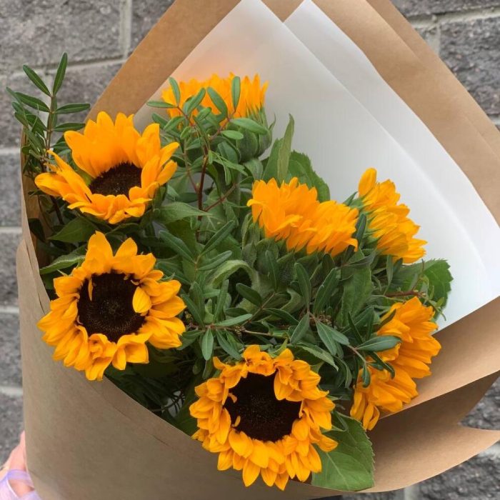 Подсолнух – 7 шт.Зелень – 5 шт.Крафт упаковка – 1 шт.Лента атласная – 1 шт.