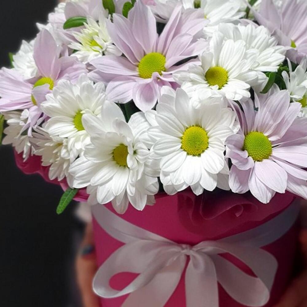 Розовые ромашки в яркой шляпной коробке !Очень стильный подарок для милой девушки !)