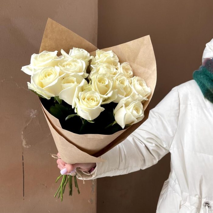 Крафт упаковка – 1 шт.Роза россия белая – 13 шт.