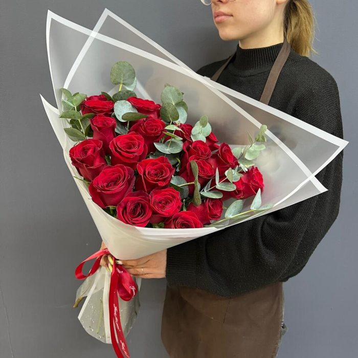 Эвкалипт – 7 шт.Атласная лента – 1 шт.Роза Эквадор 60 см – 21 шт.Дизайнерская упаковка – 1 шт.