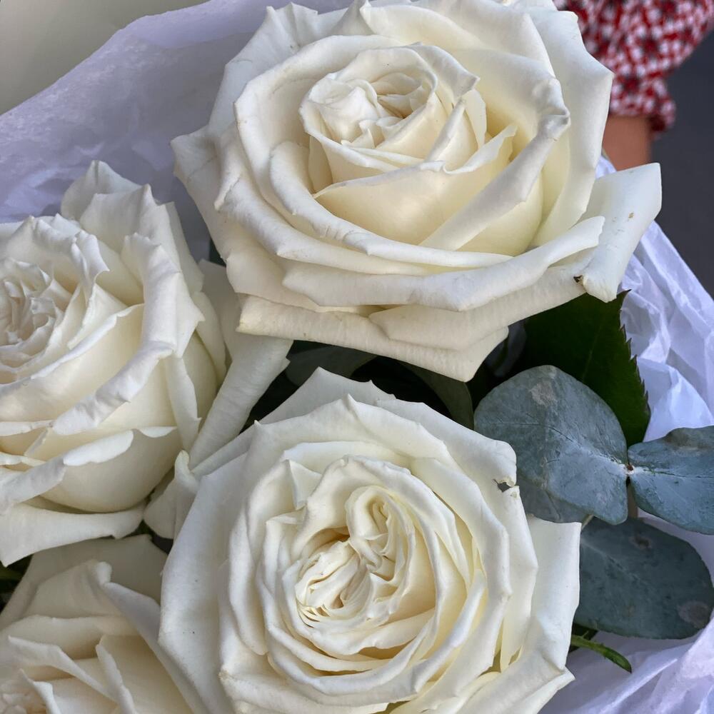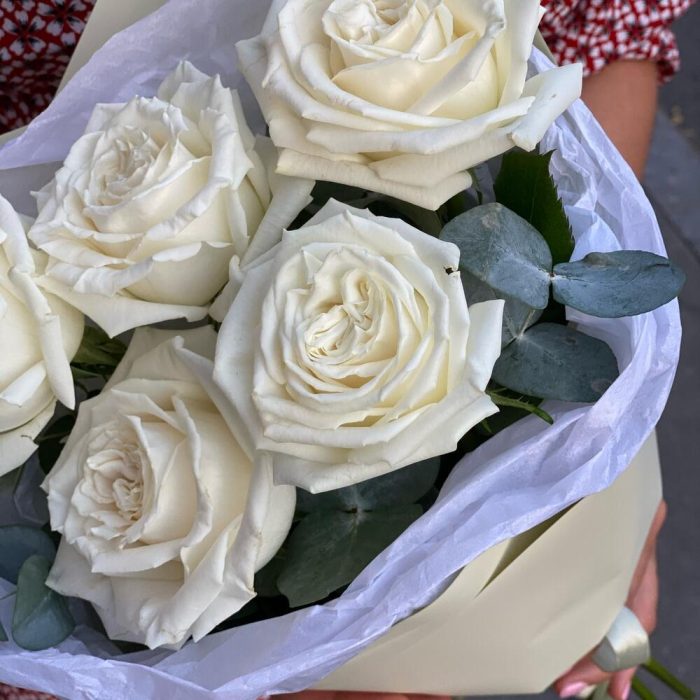 Эвкалипт – 1 шт.Упаковка дизайнерская – 1 шт.Пионовидная роза одноголовая – 5 шт.