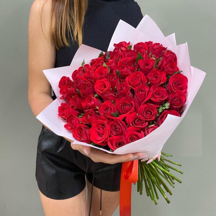 Лента атласная – 1 шт.Упаковка дизайнерская – 1 шт.Роза 40 см – 51 шт.
