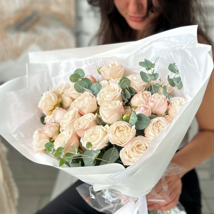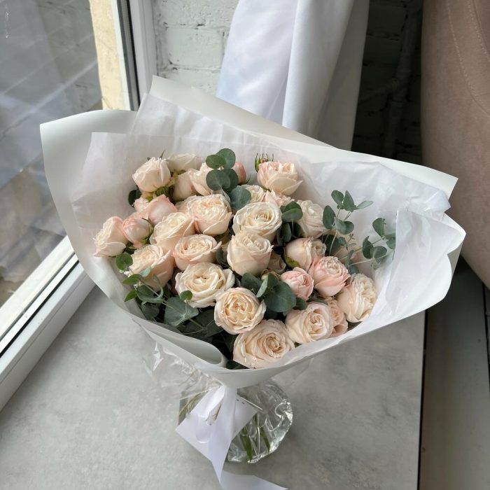 Кустовая пионовидная роза Бомбастик – 9 шт.Эвкалипт – 4 шт.