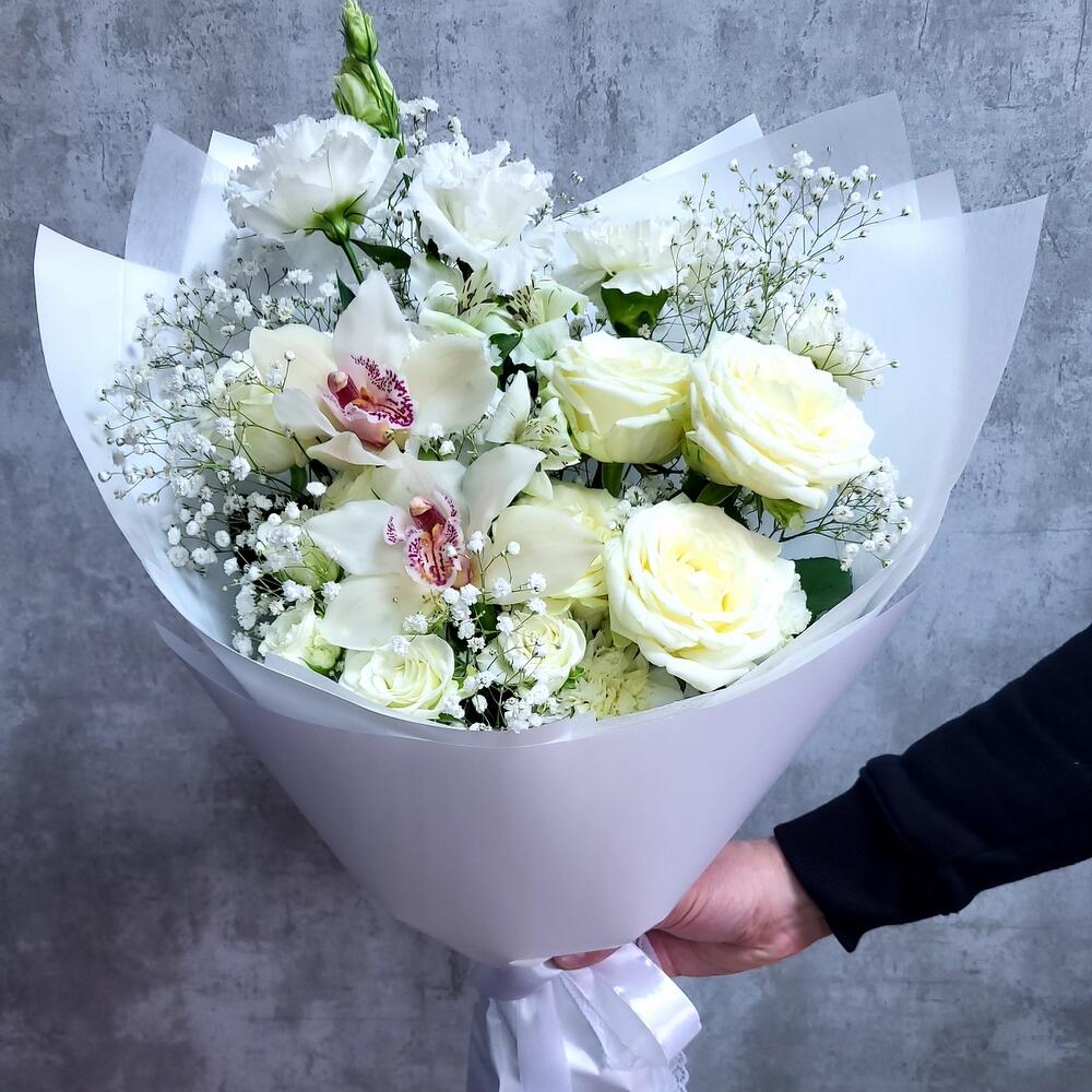 Орхидея Цимбидиум – 2 шт.Роза белая – 5 шт.Роза кустовая – 2 шт.Альстромерия – 1 шт.Гвоздика – 3 шт.Лизиантус – 1 шт.Гипсофила – 2 шт.Упаковка дизайнерская – 1 шт.