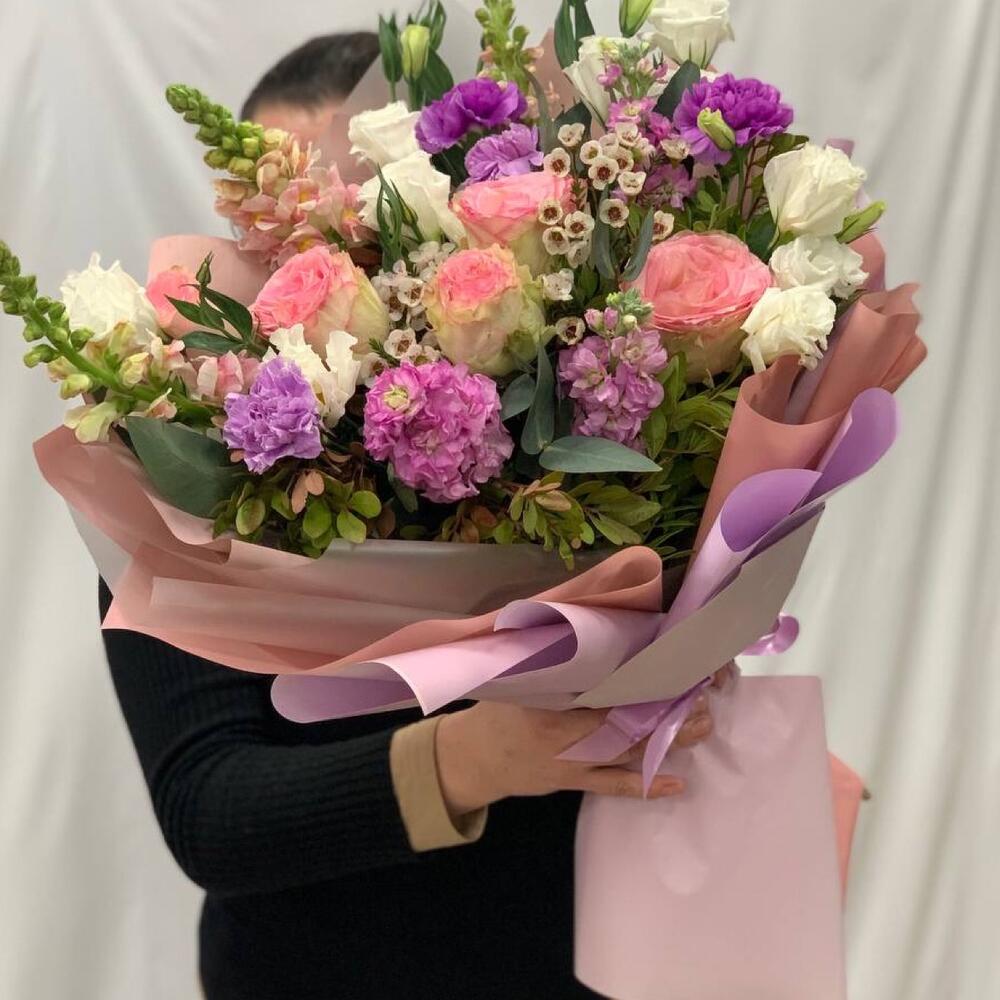 Роза Эквадор – 5 шт.антиринум – 3 шт.Маттиола – 3 шт.Лизиантус – 3 шт.Диантус – 4 шт.Ваксфлауэр – 2 шт.Эвкалипт – 6 шт.Фисташка – 6 шт.