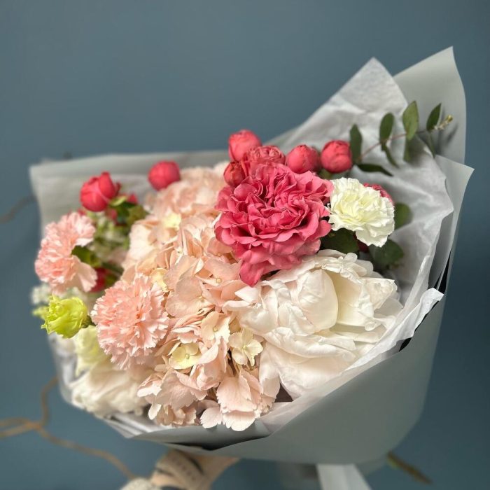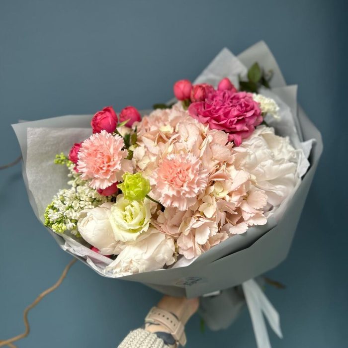 Эвкалипт – 1 шт.Сирень – 1 шт.Пион – 3 шт.роза кантри блю – 1 шт.Роза кустовая – 2 шт.Упаковка дизайнерская – 2 шт.Тишью – 3 шт.