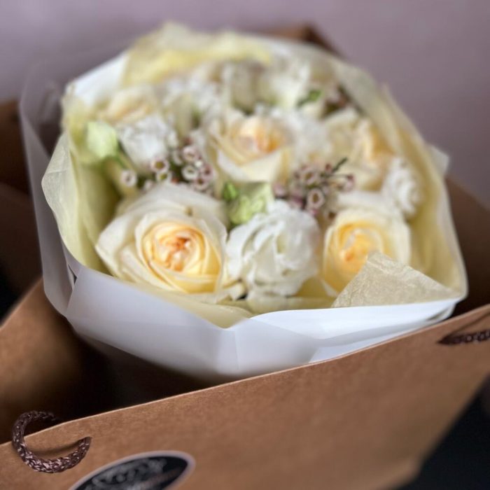 роза candelight – 7 шт.Лизиантус (эустома) – 3 шт.Хамелациум – 3 шт.декоративная упаковка – 1 шт.Атласная лента – 1 шт.