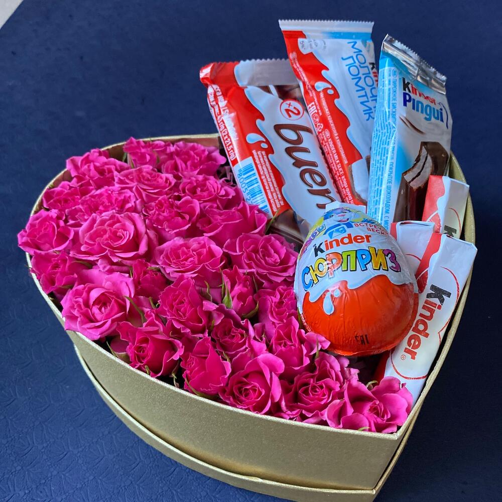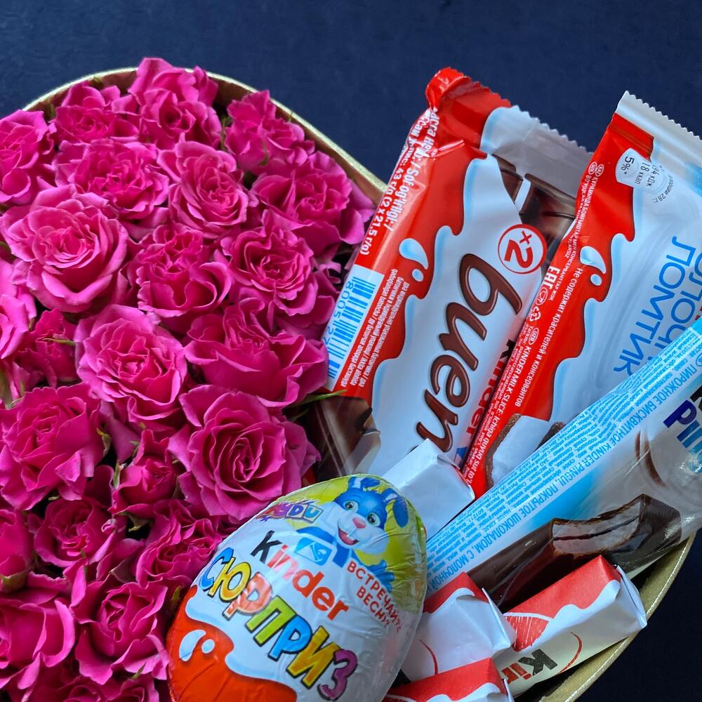 Роза кустовая розовая – 15 шт.Коробка – 1 шт.Киндер пингви – 1 шт.Kinder bueno – 1 шт.Kinder сюрприз – 1 шт.Kinder chocolate – 4 шт.Киндер молочный ломтик – 1 шт.