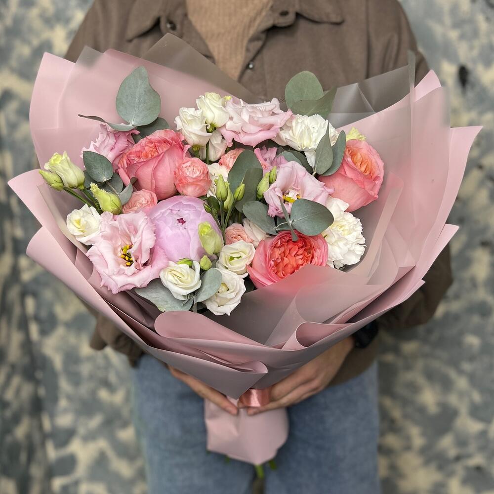 Эвкалипт – 3 шт.Лента атласная – 2 шт.Диантус – 2 шт.Пион Сара Бернар – 1 шт.Пленка матовая – 5 шт.эустома розовая махровая – 1 шт.эустома белая – 2 шт.Роза кустовая пионовидная мадам бомбастик – 1 шт.роза пионовидная пинк экспрешн – 3 шт.