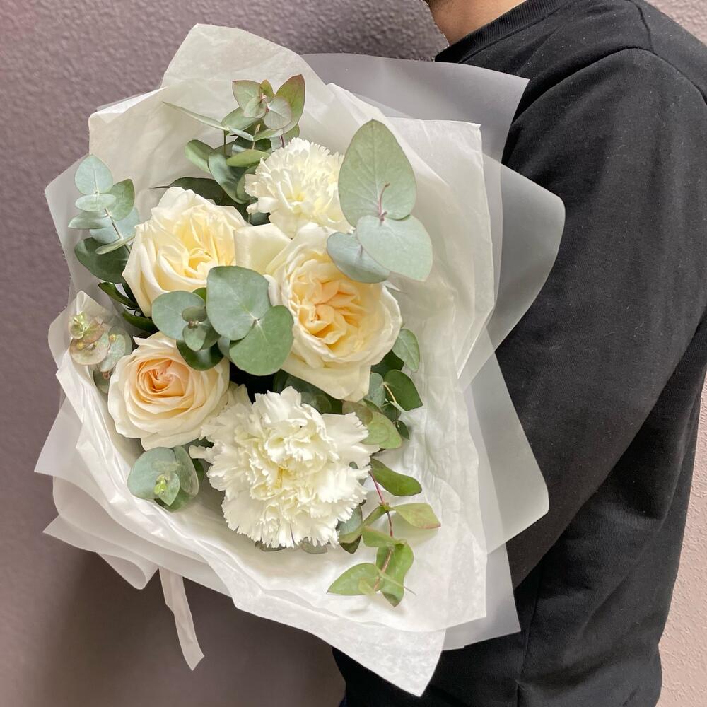 Букет «Арктика»(Роза Ароматная premium О Хара,диантус(гвоздика),эвкалипт )
