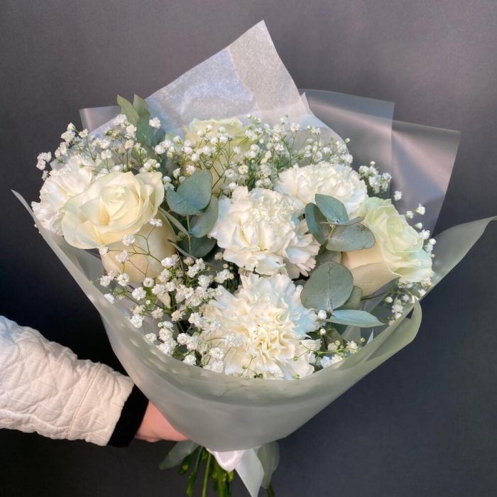 Букет белых роз, диантуса и гипсофилы «Portobellos»