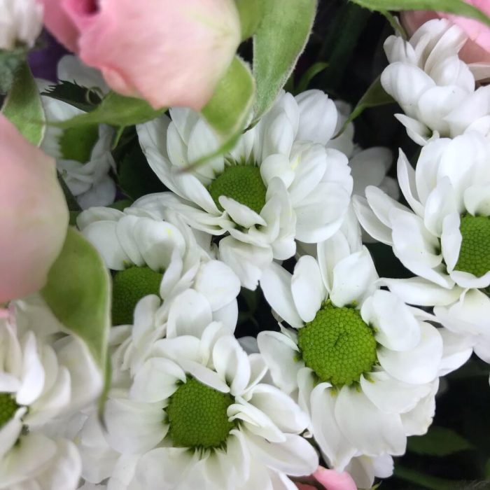 Роза кустовая – 5 шт.Диантус – 3 шт.Сантини – 2 шт.Статица – 1 шт.Эвкалипт – 1 шт.Упаковка дизайнерская – 3 шт.