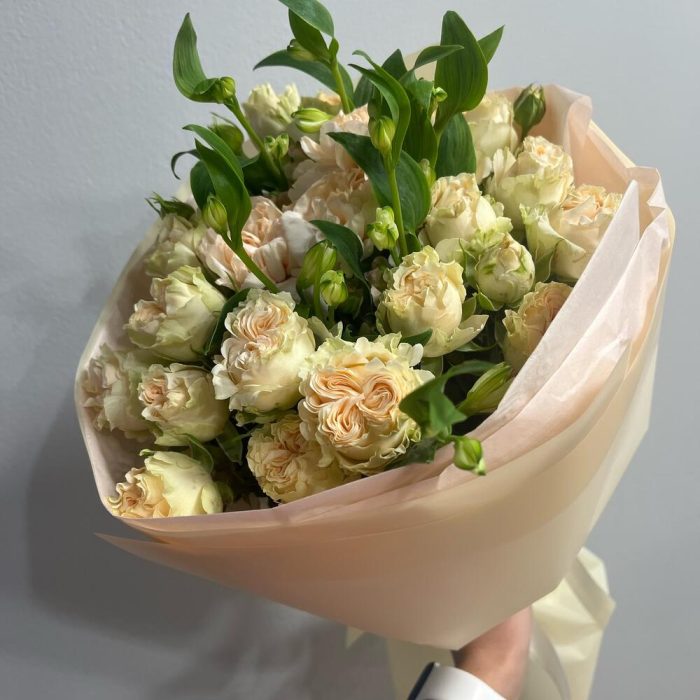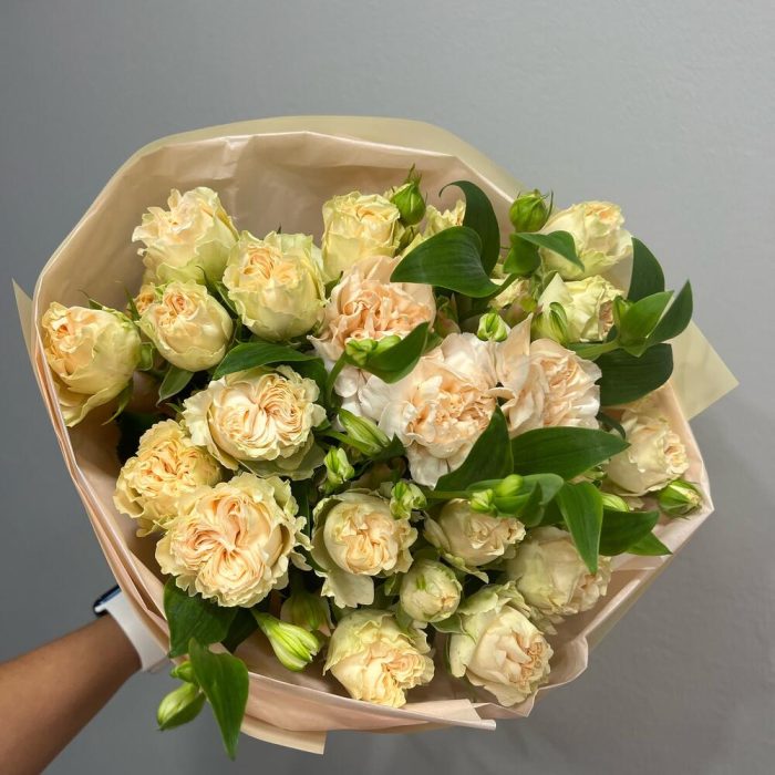 Кустовая пионовидная роза – 5 шт. Гвоздика персиковая – 3 шт. Авторская упаковка – 1 шт. шармелия – 2 шт.