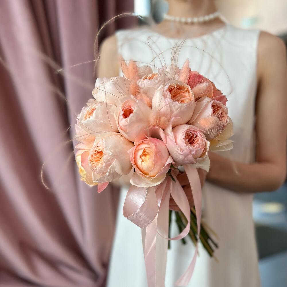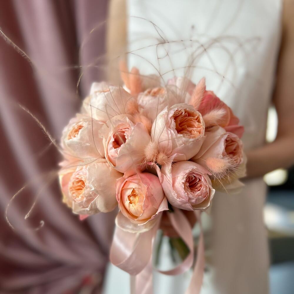 Пионовидная роза – 15 шт.Атласная лента – 1 шт.Лагурус (сухоцвет) – 12 шт.пучок сухоцветов – 5 шт.