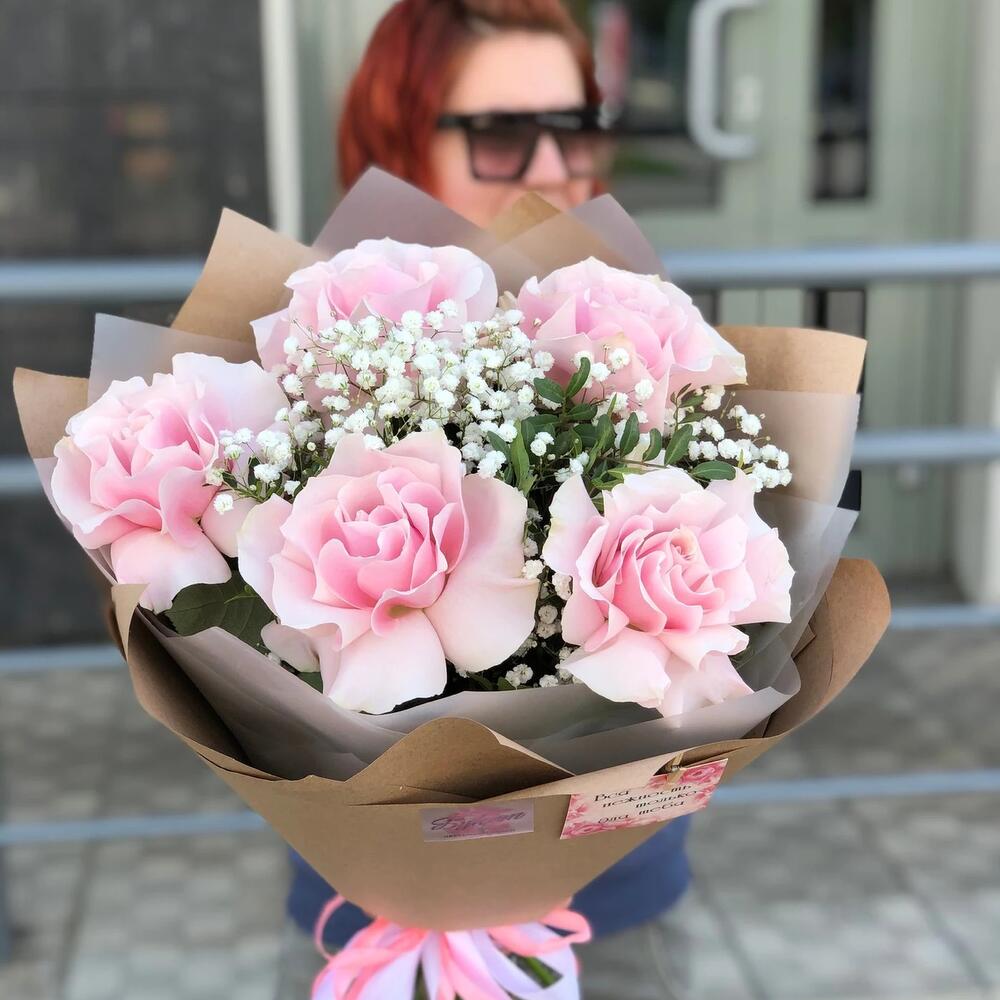 Гипсофила – 2 шт. Зелень – 1 шт. Упаковка дизайнерская – 1 шт. Французская роза – 5 шт.