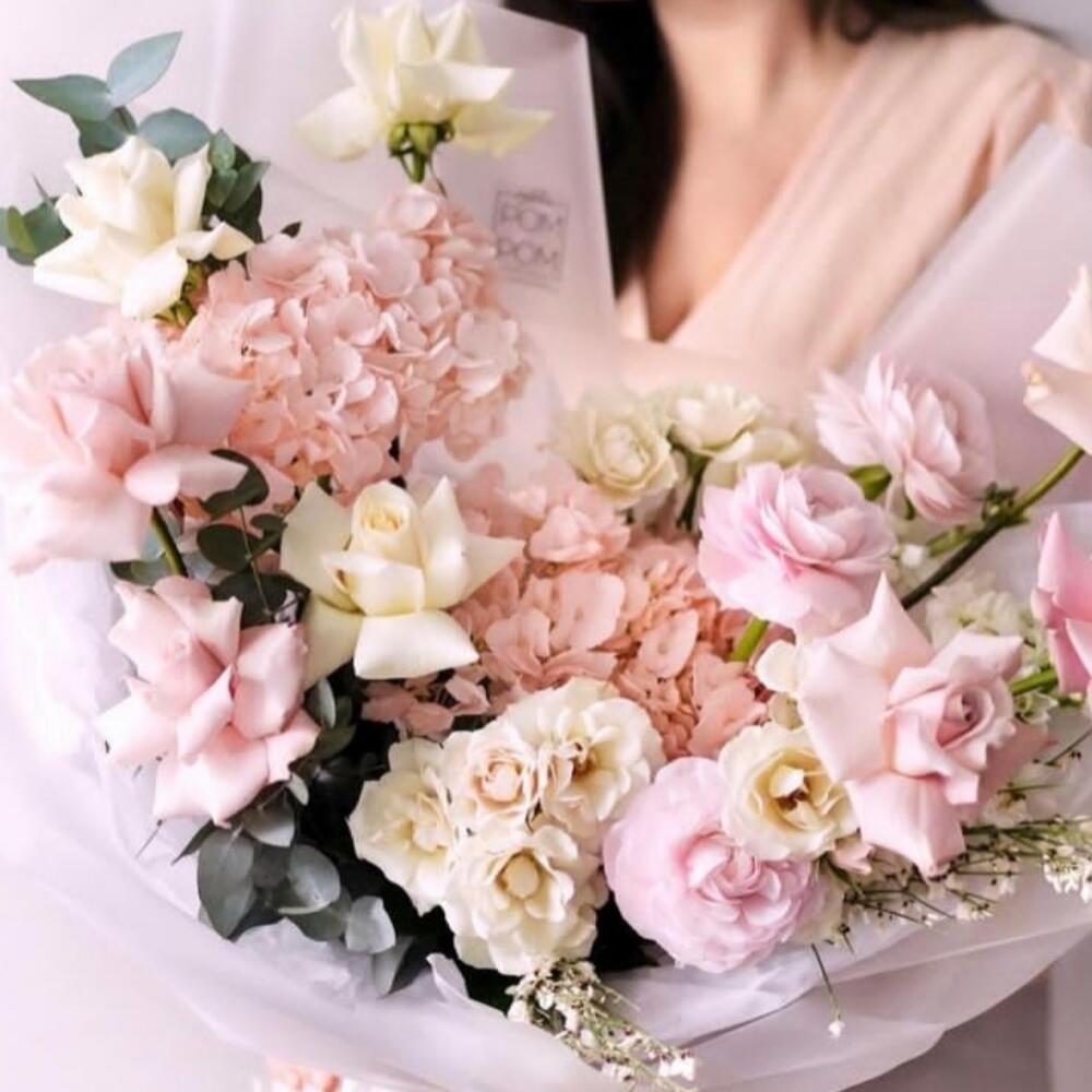 Гортензия – 2 шт.Ранункулюс – 3 шт.Роза – 8 шт.Эвкалипт – 2 шт.Гениста – 2 шт.Кустовая роза – 3 шт.Маттиола – 2 шт.Упаковка – 1 шт.