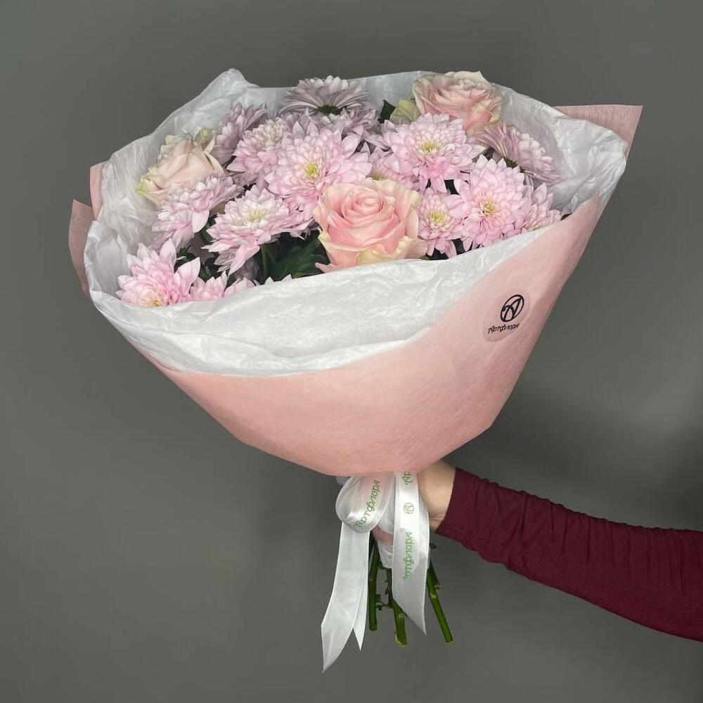 Роза Эквадор – 3 шт.Хризантема кустовая – 4 шт.Дизайнерская упаковка – 1 шт.