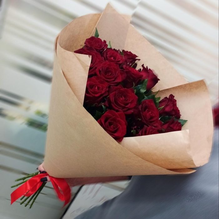 Букет из 15 красных роз Ред Наоми длиной 60 см в упаковке крафт