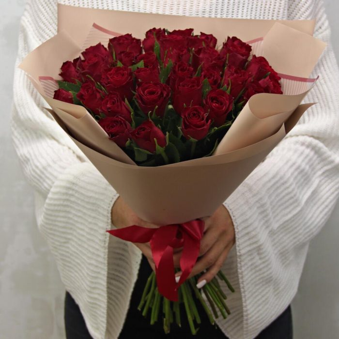Букет из 35 красных роз 35-40 см (Кения) в стильной упаковке