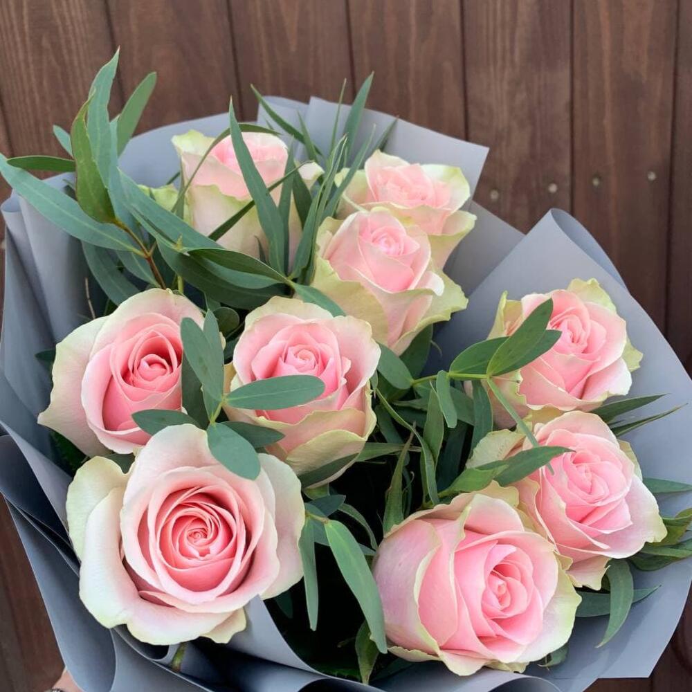 Букет из 9 розовых роз и эвкалипта