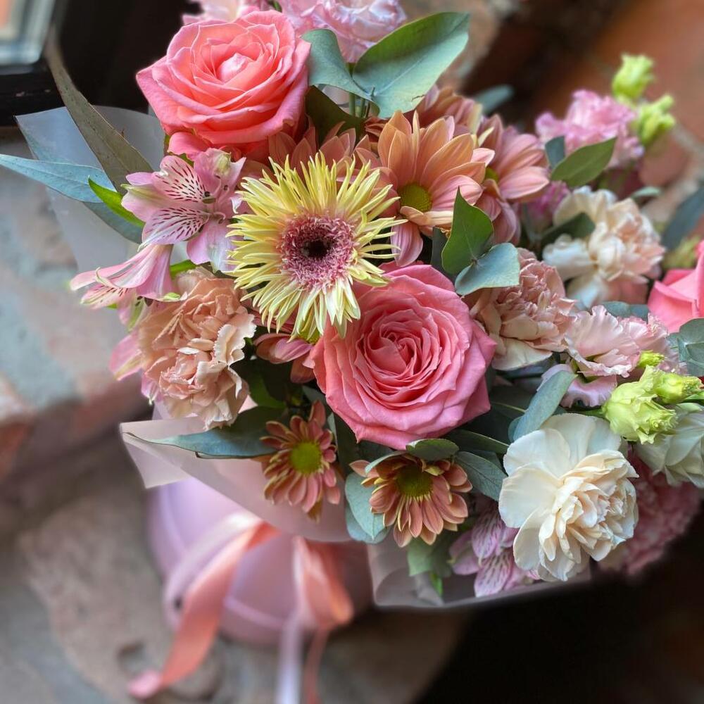 Букет из альстромерий, роз, гвоздики, эустомы, кустовой хризантемы и герберы в стильной шляпной коробке “Миръям”