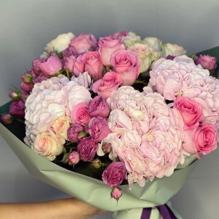 Букет из ассорти роз и розовых гортензий