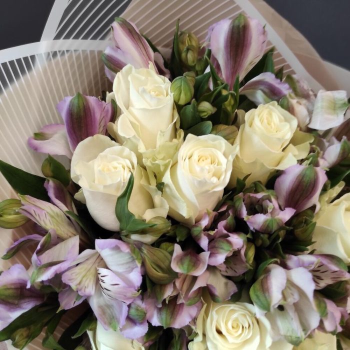 Роза – 11 шт.Альстромерия – 8 шт.Пленка матовая – 3 шт.Лента атласная – 1 шт.