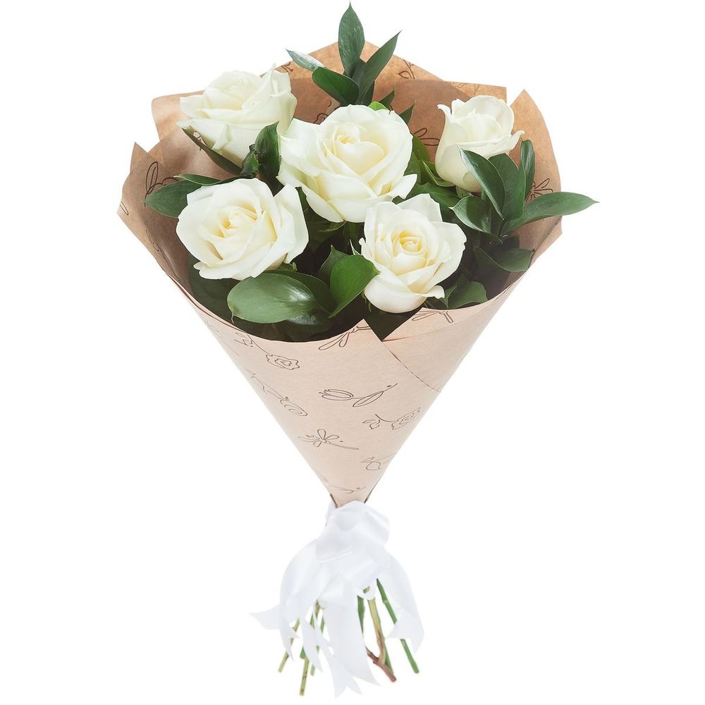 Крафт – 1 шт.Рускус – 9 шт.Роза белая – 5 шт.